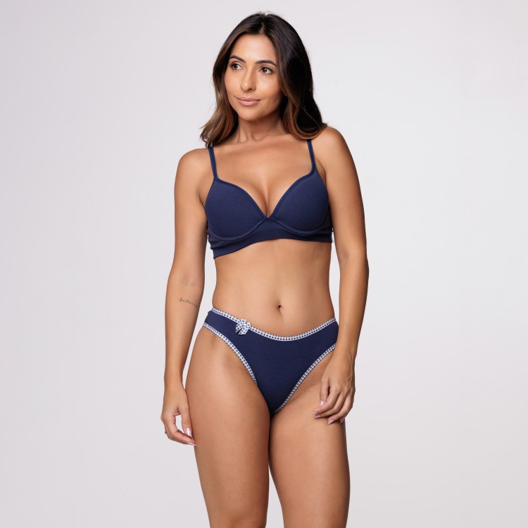 Esta calcinha básica é confeccionada em algodão egípcio, proporcionando um toque macio e confortável. O design apresenta viés em poliamida e elastano com estampa xadrez, além de um delicado laço que adiciona um toque de charme à peça. A modelagem é super confortável, ideal para o uso diário.