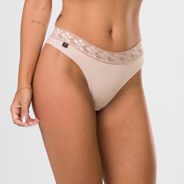 Calcinha tanga com renda na cintura na cor areia