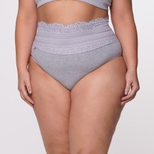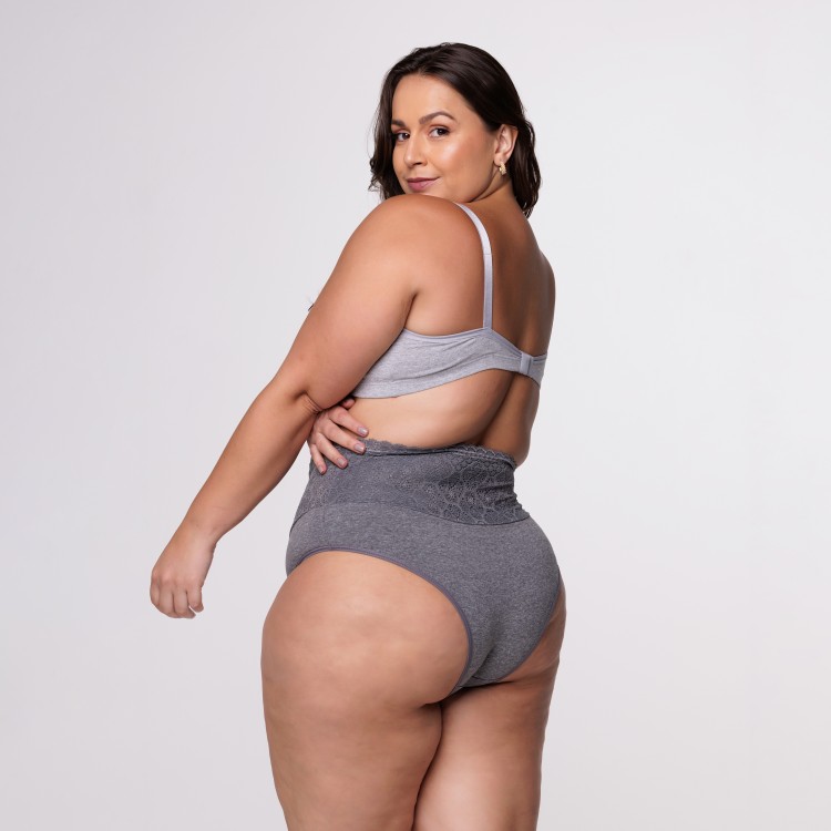 Calcinha de Cintura Alta Plus Size em Algodão Egípcio com Barra de Renda Forrada na Cor Cinza Escuro
