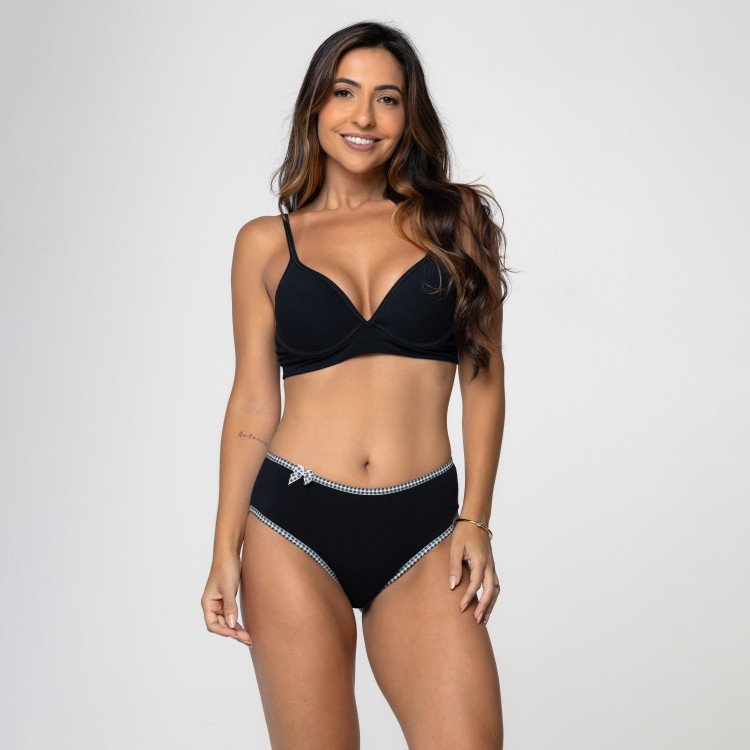 Esta calcinha na elegante cor preta destaca-se pelo delicado viés xadrez, que adiciona um toque de charme ao design clássico. O modelo oferece cobertura ideal e ajuste perfeito ao corpo, proporcionando conforto e bem-estar ao longo do dia.